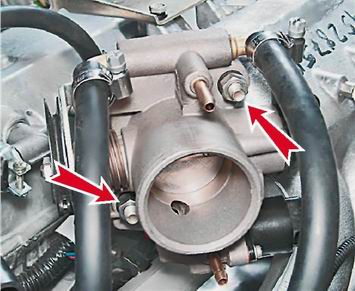 8. Отсоединяем от дроссельного узла шланг системы вентиляции картера и шланг адсорбера. 9. Торцовым ключом на 13 мм отворачиваем две гайки крепления дроссельного узла к фланцу ресивера.