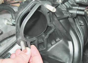 На двигателе 2111 (1,5i) снимаем со шпилек ресивера уплотнительную прокладку. Поврежденную прокладку заменяем.