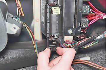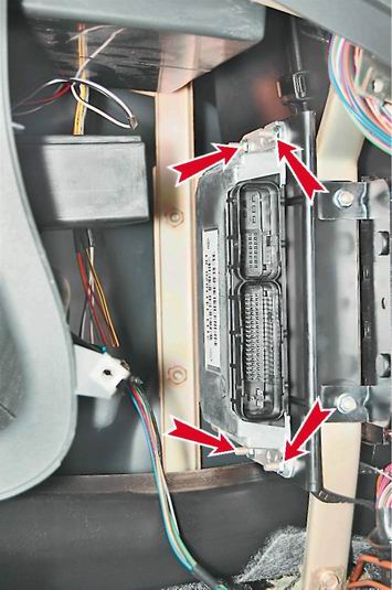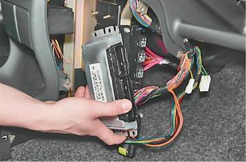 5. Сместив вперед, выводим пластмассовый кронштейн ЭБУ из зацепления со шпильками кронштейна электронных блоков и вынимаем ЭБУ из-под консоли.