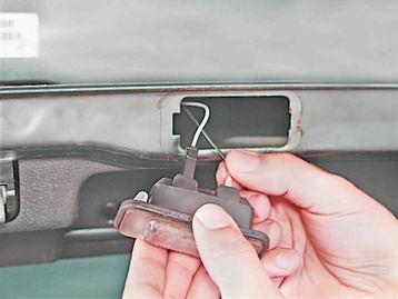 Устанавливаем фонари освещения номерного знака в обратной последовательности. При установке фонаря в дверь багажного отделения сначала вставляем правую часть фонаря в отверстие двери, а затем нажимаем на левую до защелкивания фиксатора.
