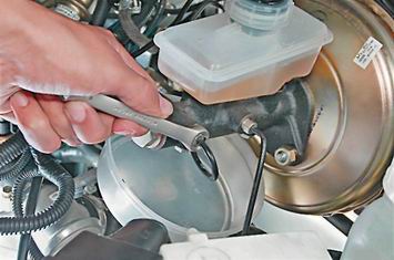4. Рожковым ключом на 10 мм полностью выворачиваем штуцера четырех трубок. Осторожно, не изгибая сильно трубки, отводим их от главного тормозного цилиндра. 5. Ключом на 17 мм отворачиваем две гайки крепления главного тормозного цилиндра к корпусу вакуумного усилителя.