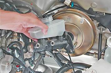 Главный тормозной цилиндр - снятие и установкаДля выполнения работы потребуется специальный ключ на 10 мм для штуцеров тормозных трубок. Снятие 1. Подготавливаем автомобиль к выполнению работы (см. "Подготовка автомобиля к техническому обслуживанию и ремонту"). 2. Резиновой грушей или шприцем отбираем тормозную жидкость из бачка главного тормозного цилиндра. 3. Специальным ключом на 10 мм ослабляем затяжку штуцеров четырех тормозных трубок главного тормозного цилиндра.