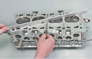 Головка блока цилиндров - проверкаДля выполнения работы потребуются: - специальный шаблон или широкая слесарная линейка; - набор плоских щупов. Последовательность выполнения 1. Снимаем головку блока цилиндров (см. "Головка блока цилиндров - снятие и установка"). 2. Очищаем головку блока от грязи и нагара, отмываем ее от масляных отложений, металлической щеткой удаляем нагар со стенок камер сгорания. 3. Внимательно осматриваем головку блока цилиндров. На ней не должно быть трещин. На рабочих поверхностях опор распределительных валов и стенках посадочных отверстий толкателей не должно быть задиров и следов наволакивания металла. Направляющие и седла клапанов должны плотно сидеть в теле головки, без следов их смещения при работе ГРМ. Клапаны и их седла не должны иметь трещин и следов прогорания. 4. Проверяем плоскостность головки. Работу проводим в два этапа. Для этого необходим специальный шаблон, но если его нет, то проверить нижнюю привал очную плоскость головки с достаточной степенью точности можно и при помощи широкой слесарной линейки. Прикладываем линейку по диагонали, ребром к плоскости головки. Убеждаемся в отсутствии зазора между ребром линейки и плоскостью головки. Зазор может наблюдаться как в средней части плоскости, так и по ее краям. Замер зазора проводим по обеим диагоналям набором плоских щупов.