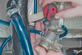 5. Крестовой отверткой ослабляем затяжку хомута крепления пластмассовой трубки гравитационного клапана и отсоединяем трубку от клапана.