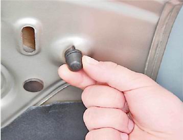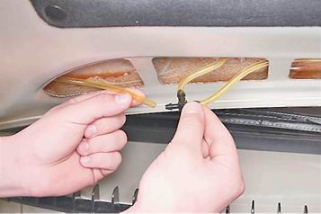 4. Вынимаем резиновый уплотнитель и выводим трубку омывателя из капота.