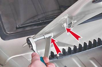 5. Любым доступным способом (фломастером, маркером) помечаем положение головок болтов на капоте. 6. С помощником, с обеих сторон капота, одновременно поддерживая его снизу, торцовым ключом на 8 мм отворачиваем по два болта крепления капота к петлям.
