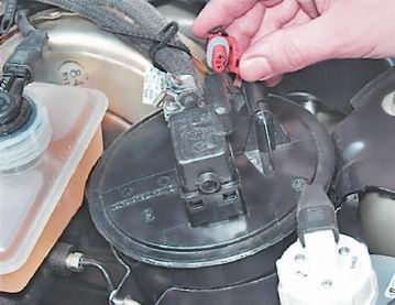 Клапан продувки адсорбера - проверка и заменаДля выполнения работы потребуются: - мультиметр (в режиме вольтметра и омметра); - отрезки проводов. Снятие и проверка 1. Подготавливаем автомобиль к выполнению работы (см. "Подготовка автомобиля к техническому обслуживанию и ремонту"). 2. Освободив фиксатор, отсоединяем колодку жгута проводов от клапана продувки адсорбера.