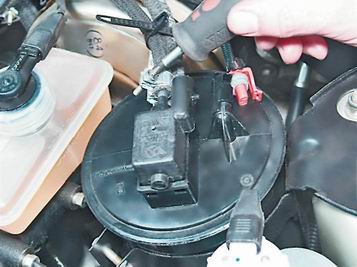 Замечание: Напряжение на выводе должно быть не меньше 12 В. Если напряжение не поступает на колодку, или оно меньше 12 В, то разряжена аккумуляторная батарея, неисправна цепь питания или неисправен ЭБУ. 5. Крестовой отверткой ослабляем затяжку хомута крепления шланга к клапану продувки адсорбера и снимаем шланг с патрубка клапана.