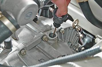 Коробка передач - проверка уровня маслаУровень масла в коробке передач проверяем при техническом обслуживании автомобиля, а также перед каждой поездкой при утечке масла из коробки. Проверку проводим при неработающем двигателе. Последовательность выполнения 1. Подготавливаем автомобиль к выполнению работы (см. "Подготовка автомобиля к техническому обслуживанию и ремонту"). 2. Снимаем корпус воздушного фильтра (см. "Воздушный фильтр - снятие и установка"). 3. Извлекаем указатель уровня масла из отверстия в картере коробки передач.