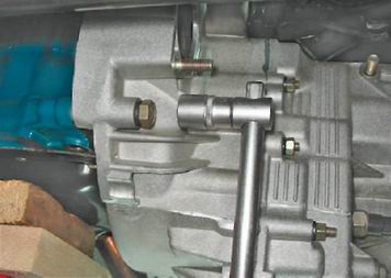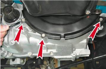 11. Снимаем нижнюю крышку картера. 12. Устанавливаем под двигатель регулируемую подставку и снимаем левую и заднюю опоры силового агрегата (см. "Опоры силового агрегата - снятие и установка"). Замечание: Дальнейшую работу выполняем с помощником или устанавливаем под коробку передач регулируемую подставку. 13. Торцовым ключом на 19 мм отворачиваем три болта, а также одну гайку крепления коробки передач к двигателю.