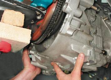 Замечание: Верхний болт крепления коробки передач с правой стороны двигателя (при взгляде на него со стороны коробки передач) короче остальных. Предупреждение! При снятии коробки передач не опирайте ее первичный вал на диафрагменную пружину сцепления, это может привести к повреждению последней. 15. Покачивая коробку передач из стороны в сторону, снимаем ее с направляющих втулок и аккуратно выводим первичный вал из отверстия ведомого диска и корзины сцепления.