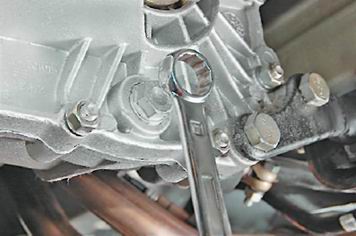 Коробка передач - замена маслаМасло в коробке передач заменяем через 75000 км пробега либо через пять лет эксплуатации, в зависимости от того, что наступит раньше. Тип применяемого масла указан в разделе "Справочные данные". Совет: Масло лучше менять сразу после поездки, пока оно горячее, так масло быстрее и полнее сливается вместе со взвешенными частицами износа. Предупреждение! Температура разогретого масла может достигать 90°С, будьте осторожны. Для выполнения работы потребуются: - смотровая яма или эстакада; - широкая емкость объемом не менее 4 литров; - воронка или специальный шприц. Последовательность выполнения 1. Подготавливаем автомобиль к выполнению работы (см. "Подготовка автомобиля к техническому обслуживанию и ремонту"). 2. Устанавливаем под сливное отверстие картера коробки передач емкость. 3. Накидным ключом на 17 мм отворачиваем пробку сливного отверстия.