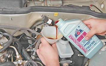 4. Сливаем масло. 5. Дождавшись полного слива масла из коробки, заворачиваем пробку на место. Совет: Если слитое из коробки передач масло темного цвета и в нем заметны металлические частицы, коробку следует промыть. Для этого залейте в картер коробки 1-1,5 л специального промывочного масла. Вывесив одно из ведущих колес, запустите двигатель и включите первую передачу. Через 5-7 мин. выключите двигатель, слейте промывочное масло и залейте чистое трансмиссионное. 6. Вынимаем указатель уровня масла (см. выше, "Коробка передач - проверка уровня масла"). 7. Протираем указатель, удаляя с него масло. 8. Через отверстие указателя шприцем или через воронку, с надетой на нее трубкой (шлангом), заливаем в коробку передач 3,3 л трансмиссионного масла.