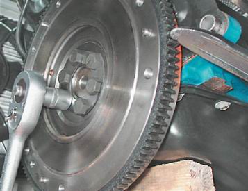 3. Торцовым ключом на 17 мм отворачиваем шесть болтов крепления маховика, удерживая его от проворачивания монтажной лопаткой или отверткой, уперев ее в выступ блока цилиндров.