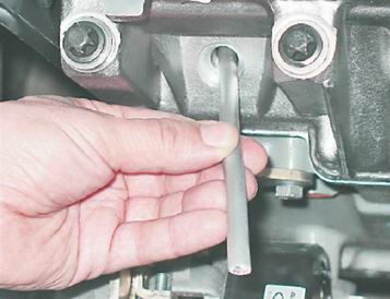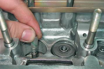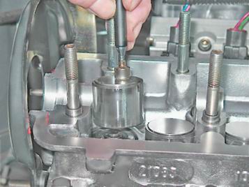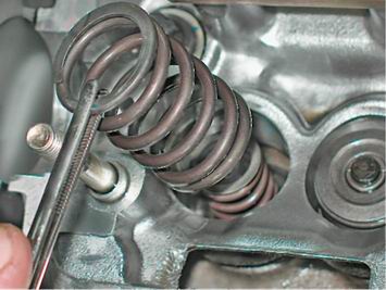 3. Чтобы установить толкатели на прежние места, маркируем их или раскладываем в порядке расположения в двигателе. 4. Выворачиваем свечу цилиндра, у клапана которого заменяем маслосъемный колпачок (см. "Свечи зажигания - проверка и замена"). 5. Вставляем оловянный пруток в свечное отверстие, так чтобы его конец оказался под тарелкой соответствующего клапана.