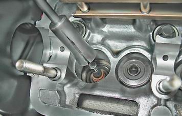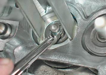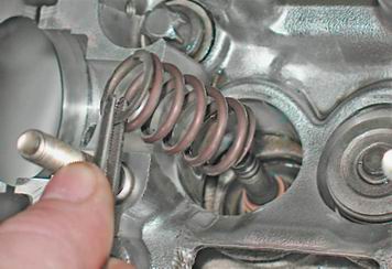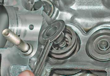 6. Устанавливаем приспособление для рассухаривания клапанов на шпильки головки блока цилиндров. 7. Чашку приспособления упираем в тарелку пружины. Предупреждение! При выполнении следующей операции не поцарапайте рассухаривателем стенки посадочного отверстия толкателя в головке блока цилиндров! 8. Надавив на ручку рассухаривателя, сжимаем пружины клапана. 9. Удерживая пружины сжатыми, пинцетом извлекаем два сухаря.