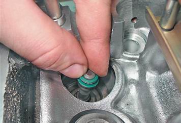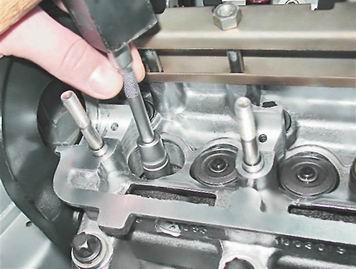 Маслосъемные колпачки - заменаДля выполнения работы потребуются: - рассухариватель; - пинцет; - съемник маслосъемных колпачков; - оправка для запрессовки колпачков; - оловянный пруток; - магнит. Снятие 1. Снимаем распределительный вал (см. "Распределительный вал - снятие и установка"). 2. Магнитом вынимаем из посадочных мест в головке блока цилиндров толкатели с регулировочными шайбами.