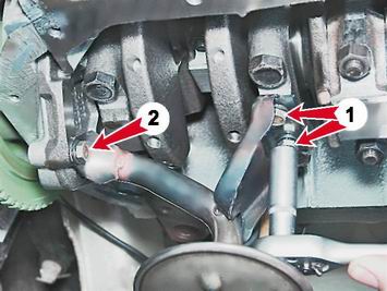 2. Ключом на 10 мм отворачиваем два болта (1) крепления маслозаборника к крышке коренного подшипника и болт (2) крепления маслоприемника к корпусу масляного насоса.