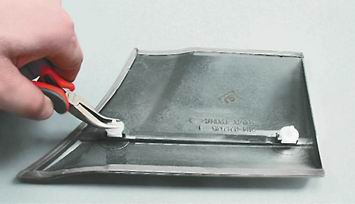 3. С внутренней стороны крыла плоскогубцами с узкими губками сжимаем выступы пластмассовых держателей накладок (показано на снятой накладке).