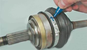Наружный шарнир привода - снятие, замена защитного чехла и установкаДля выполнения работы потребуются: - специальные клещи для установки хомутов крепления чехлов ШРУСов или раздвижные пассатижи; - съемник наружных стопорных колец; - смазка для ШРУСов - 40 см³; - новый защитный чехол шарнира; - новые упорное и стопорное кольца шарнира. Снятие 1. Снимаем привод в сборе (см. "Привод переднего колеса - снятие и установка"). 2. Концы всех четырех хомутов внутреннего и наружного шарниров на обоих валах направлены в сторону, противоположную вращению приводов при движении вперед. Для обеспечения правильной сборки, если хомуты будут использоваться повторно, маркером наносим на них метки, указывающие направление вращения.