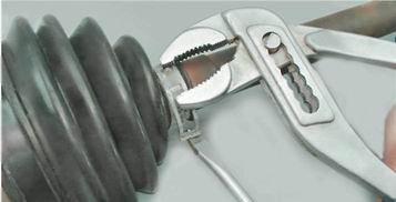 10. При помощи больших раздвижных пассатижей или специальных клещей для установки хомутов и шлицевой отвертки устанавливаем большой и малый хомуты защитного чехла. Хомуты устанавливаем с учетом направления вращения привода. Наружный конец хомутов должен быть направлен в сторону, противоположную вращению привода при движении вперед.