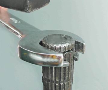 Совет: Не используйте для установки упорного кольца торцовую головку. Внутренняя фаска, имеющаяся почти на всех головках, сожмет кольцо, что не позволит установить его на вал. 3. Закрепляем вал привода в тисках вертикально. Используя рожковый ключ на 24 мм как оправку, устанавливаем на шлицевой конец вала упорное кольцо.
