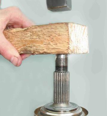 4. Аналогично устанавливаем стопорное кольцо. 5. Смазываем шлицы вала смазкой для ШРУСов. 6. Устанавливаем шарнир на шлицевой конец вала. Через деревянный брусок запрессовываем шарнир на вал до его фиксации стопорным кольцом.