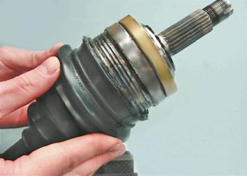 Совет: Перед установкой собранного привода на автомобиль обязательно поставьте новое стопорное кольцо на шлицевой хвостовик внутреннего шарнира. 11. Устанавливаем привод в сборе на автомобиль (см. "Привод переднего колеса - снятие и установка"). |