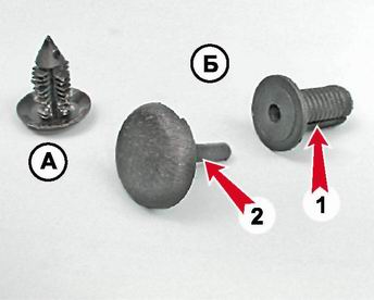 Держатели обивки: А - держатель 2108-6307032; Б - составной держатель (1 - держатель 2108-5402271; 2 - фиксатор 2108-5402270) Снятие 1. Подготавливаем автомобиль к выполнению работы (см. "Подготовка автомобиля к техническому обслуживанию и ремонту"). 2. Открываем дверь багажного отделения. 3. Съемником держателей (или поддевая шлицевой отверткой) извлекаем десять держателей (по пять на каждой стороне)...