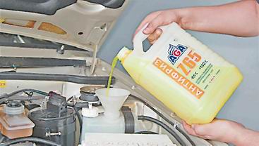 6. После того, как жидкость перестанет вытекать из блока цилиндров, заворачиваем обе пробки на место. 7. Отворачиваем и снимаем пробку расширительного бачка. 8. Заливаем в расширительный бачок новую охлаждающую жидкость. Совет: Используйте охлаждающую жидкость с температурой замерзания на 10-15°С ниже среднестатистической температуры в зимний период в регионе, в котором будет эксплуатироваться автомобиль.