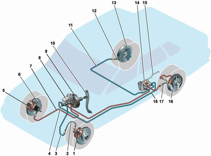 Рабочая тормозная система: 1 - тормозной механизм переднего левого колеса; 2, 6, 12, 17 - тормозные шланги; 3, 7, 11, 18 - тормозные трубки; 4 - главный тормозной цилиндр; 5 - тормозной механизм переднего правого колеса; 8 - бачок главного тормозного цилиндра; 9 - вакуумный усилитель; 10 - педаль тормоза; 13 - тормозной механизм заднего правого колеса; 14 - регулятор давления жидкости в тормозных механизмах задних колес; 15 - рычаг регулятора давления жидкости в тормозных механизмах задних колес; 16 - тормозной механизм заднего левого колеса Регулятор давления жидкости ограничивает поступление жидкости в задние тормозные механизмы при недостаточной нагрузке на заднюю ось, тем самым, предотвращая блокировку задних колес и занос задней оси автомобиля при резком торможении. В корпусе регулятора имеется контрольное отверстие, закрытое пластмассовой заглушкой. Подтекание жидкости из этого отверстия свидетельствует о негерметичности колец регулятора. Для уменьшения усилия, прикладываемого водителем к педали тормоза, в приводе тормозной системы установлен вакуумный усилитель, работающий за счет использования разрежения, образующегося во впускном трубопроводе работающего двигателя. Предупреждение! Не выключайте двигатель до полной остановки автомобиля. На корпусе главного тормозного цилиндра установлен бачок с тормозной жидкостью. В крышке бачка установлен датчик недостаточного уровня тормозной жидкости. При опасном падении уровня жидкости в бачке, датчик включает контрольную лампу на щитке приборов. |