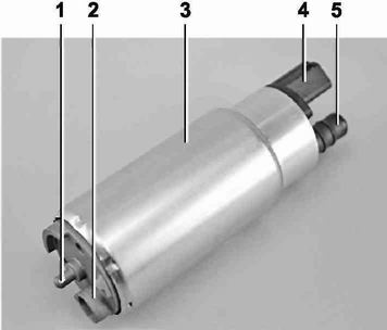 Топливный насос: 1 - выступ для крепления сетчатого фильтра; 2 - топливозаборный патрубок для подсоединения сетчатого фильтра; 3 - корпус; 4 - колодка электрического разъема; 5 - выходной (нагнетающий) патрубок для соединения с крышкой топливного модуля гофрированной трубкой От насоса по гофрированной трубке топливного модуля (см. ниже) бензин поступает в топливопровод и далее в топливный фильтр, где топливо подвергается более тщательной очистке. Топливный фильтр - бумажный, установлен в металлическом неразборном корпусе. Очищенное топливо поступает по топливопроводу в топливную рампу.