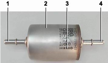 Топливный фильтр двигателя 11183 (1,6i): 1 - входной патрубок; 2 - корпус; 3 - стрелка направления потока топлива (нарисована краской на корпусе фильтра); 4 - выходной патрубок Примечание. Топливный фильтр двигателя 2111 (1,5i) имеет соединительные патрубки с резьбой. Топливная рампа удерживает четыре форсунки и подводит к ним топливо. Соединение рампы с форсунками уплотнено резиновыми кольцами. Регулятор давления топлива - перепускной клапан, который поддерживает в системе (топливопроводе) рабочее давление, необходимое для правильной работы системы впрыска. Все автомобили последних лет выпуска оборудованы системой улавливания паров топлива (в соответствии с экологическими требованиями ЕВРО II), где надтопливное пространство бака связано с атмосферой не напрямую, а через элементы этой системы. Система состоит из сепаратора, предохранительного клапана, адсорбера, гравитационного клапана, клапана продувки адсорбера, обратного клапана, соединительных трубок и шлангов. Сепаратор и гравитационный клапан закреплены под правым задним крылом автомобиля. В сепараторе пары бензина частично конденсируются и возвращаются обратно в топливный бак. Гравитационный клапан препятствует вытеканию топлива из бака при переворачивании автомобиля. Предохранительный (двухходовой) клапан препятствует образованию избыточного давления паров топлива в баке, а также возникновению там разрежения, вызванного расходом топлива.