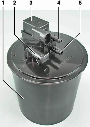 Адсорбер: 1 - корпус адсорбера; 2 - патрубок для связи внутренней полости адсорбера с атмосферой; 3 - клапан продувки адсорбера; 4 - соединительный патрубок клапана; 5 - соединительный патрубок адсорбера Особенности системы питания двигателя 2111 (1,5i)