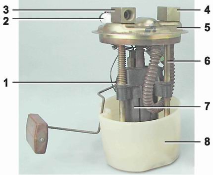 Топливный модуль двигателя 2111 (1,5i): 1 - датчик указателя уровня топлива; 2 - соединительная колодка; 3 - входной патрубок; 4 - выходной (нагнетающий) патрубок; 5 - крышка модуля; 6 - направляющая крышки модуля; 7 - электробензонасос в пластмассовом кожухе; 8 - заборная камера