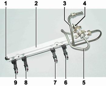 Топливная рампа двигателя 2111 (1,5i) в сборе с форсунками: 1 - диагностический штуцер; 2 - топливная рампа; 3 - трубка подвода топлива к топливной рампе; 4 - регулятор давления топлива; 5 - трубка отвода (слива) топлива в бак; 6, 7, 8 и 9 - форсунки Регулятор давления топлива установлен на топливной рампе. Избыточное количество топлива возвращается в бак по сливному топливопроводу.