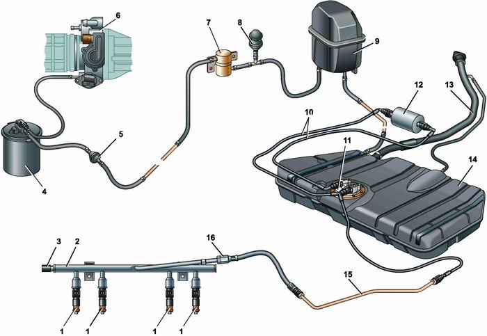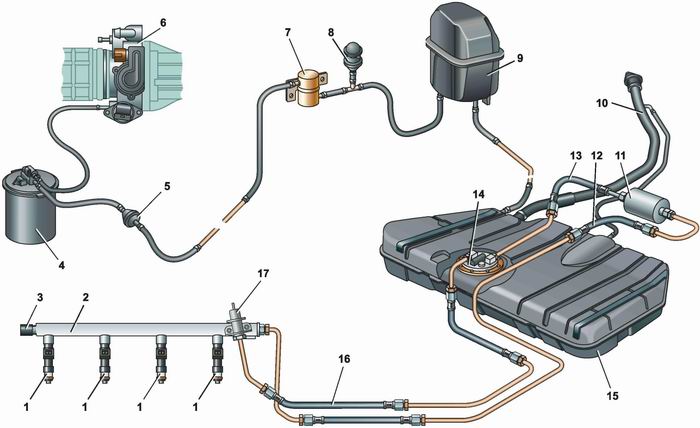 Схема системы питания двигателя 11183 (1,6i): 1 - форсунка; 2 - топливная рампа; 3 - диагностический штуцер; 4 - адсорбер; 5 - обратный клапан; 6 - дроссельный узел; 7 - гравитационный клапан; 8 - предохранительный (двухходовой) клапан; 9 - сепаратор; 10 - трубки топливопровода, соединяющие топливный модуль с топливным фильтром; 11 - топливный модуль; 12 - топливный фильтр; 13 - заливная труба; 14 - топливный бак; 15 - топливопровод, соединяющий топливный модуль с топливной рампой; 16 - металлическая трубка топливопровода; 17 - соединительный шланг; 16 - штуцер для соединения топливной рампы с топливопроводом |
