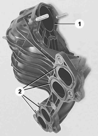Впускной модуль двигателя 11183 (1,6i): 1 - фланец с уплотнительным кольцом для крепления дроссельного патрубка; 2 - ресивер с уплотнительными кольцами для подсоединения к впускному трубопроводу