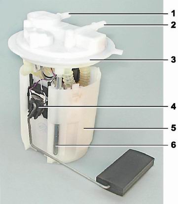 Топливный модуль двигателя 11183 (1,6i): 1 - входной патрубок (для подвода топлива к регулятору давления); 2 - выходной (нагнетающий) патрубок; 3 - крышка модуля; 4 - датчик указателя уровня топлива; 5 - заборная камера; 6 - направляющая крышки модуля Топливный насос объединен с датчиком указателя уровня топлива и регулятором давления топлива в единый узел - топливный модуль (часто называемый - электробензонасос). Топливо из насоса (через выходной патрубок топливного модуля) поступает в топливный фильтр. Очищенный бензин вновь по топливопроводу и через тройник подводится к впускному патрубку топливного модуля, и далее - подается в топливную рампу.