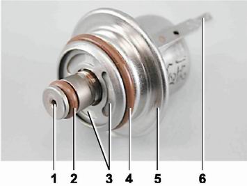 Регулятор давления топлива двигателя 11183 (1,6i): 1 - отверстие для сброса избыточного топлива; 2, 4 - уплотнительные кольца; 3 - отверстия для подвода топлива в регулятор; 5 - корпус; 6 - вывод для соединения регулятора с "массой"