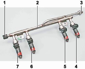 Топливная рампа двигателя 11183 (1,6i) в сборе с форсунками: 1 - диагностический штуцер; 2 - топливная рампа; 3 - штуцер для соединения с топливопроводом; 4, 5, 6 и 7 - форсунки Избыточное количество топлива стравливается через регулятор давления в бак. Регулятор давления топлива установлен в крышке топливного модуля.