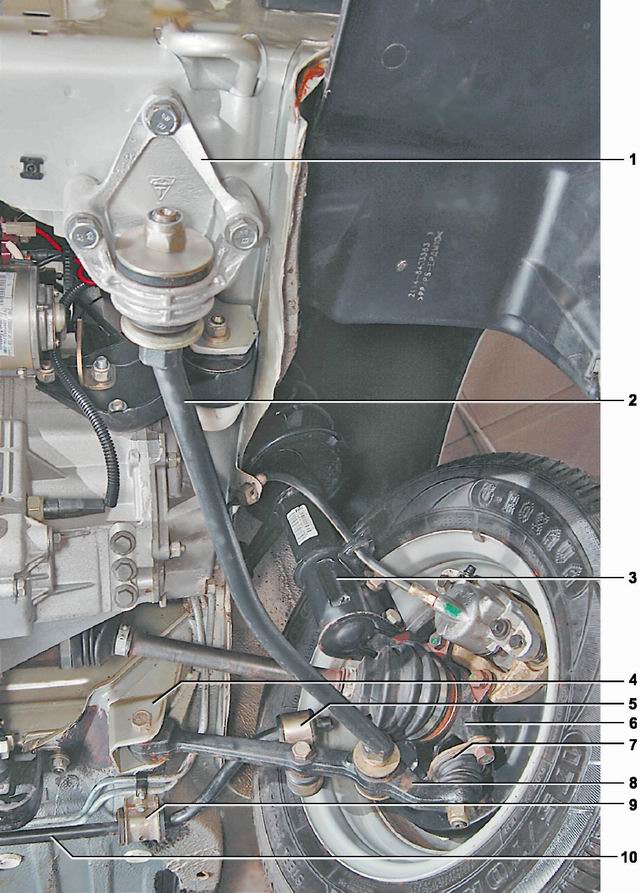 Передняя подвеска: 1 - кронштейн растяжки; 2 - продольная растяжка; 3 - телескопическая стойка; 4 - кронштейн поперечного рычага; 5 - стойка стабилизатора; 6 - поворотный кулак; 7 - шаровая опора; 8 - поперечный рычаг; 9 - скоба крепления штанги стабилизатора; 10 - штанга стабилизатора Цилиндрическая пружина своим нижним витком опирается в нижнюю опорную чашку, а верхним - в верхнюю опорную чашку, закрепленную на штоке амортизатора. Также на штоке амортизатора установлена верхняя опора стойки, состоящая из корпуса, резиновой подушки и подшипника. Корпус опоры крепится к кузову автомобиля тремя шпильками с гайками. Подшипник позволяет штоку амортизатора поворачиваться в опоре при повороте стойки, а резиновый буфер препятствует передаче вибраций на корпус автомобиля. Шток амортизатора защищен от грязи и пыли гофрированным кожухом. При пробое подвески ход штока ограничен буфером хода сжатия. Поворотный рычаг стойки соединяется с рулевой тягой через шаровой палец. Изменение длины тяги при помощи ее соединительной муфты позволяет регулировать схождение передних колес.