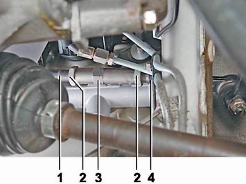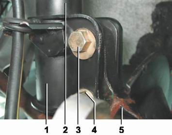 Соединительная муфта рулевой тяги: 1 - рулевая тяга; 2 - контргайка; 3 - соединительная муфта; 4 - наконечник рулевой тяги Поворотный кулак крепится к кронштейну стойки двумя болтами с гайками. Верхнее отверстие кронштейна выполнено овальным, а установленный в него болт имеет эксцентриковый поясок и эксцентриковую шайбу. При вращении этого болта поворотный кулак смещается относительно стойки, поворачиваясь на болте нижнего крепления, как на оси. Благодаря этому изменяется угол между стойкой и кулаком, что, в свою очередь, позволяет регулировать развал переднего колеса.