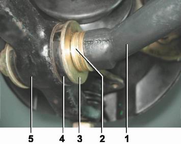 Крепление поворотного кулака к стойке: 1 - кронштейн крепления поворотного кулака; 2 - корпус стойки; 3 - болт (эксцентриковый) верхнего крепления поворотного кулака; 4 - болт нижнего крепления поворотного кулака; 5 - поворотный кулак В отверстие поворотного кулака запрессован и зафиксирован двумя стопорными кольцами двухрядный шариковый подшипник. Во внутреннее кольцо подшипника запрессована ступица колеса. Снизу поворотный кулак соединен с поперечным рычагом подвески при помощи шаровой опоры. От перемещения поперечный рычаг удерживается растяжкой, которая своим задним концом крепится через резинометаллический шарнир к рычагу, а передним - через подушку к кронштейну, закрепленному на кузове автомобиля. Изменяя количество шайб в переднем и заднем креплениях растяжки, можно изменять положение рычага, регулируя тем самым угол продольного наклона оси поворота колеса.