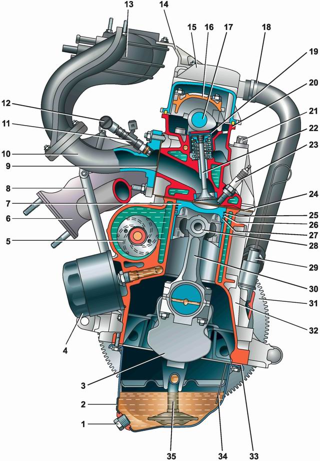 Поперечный разрез двигателя 11183 (1,6i): 1 - пробка сливного отверстия поддона картера; 2 - поддон картера двигателя; 3 - коленчатый вал; 4 - масляный фильтр; 5 - насос охлаждающей жидкости; 6 - выпускной коллектор; 7 - поршень; 8 - штанга крепления впускного трубопровода; 9 - прокладка впускного трубопровода и выпускного коллектора; 10 - впускной трубопровод; 11 - форсунка; 12 - топливная рампа; 13 - ресивер; 14 - кронштейн; 15 - крышка головки блока цилиндров; 16 - корпус подшипников распределительных валов; 17 - распределительный вал; 18 - шланг системы вентиляции картера; 19 - толкатель клапана; 20 - головка блока цилиндров; 21 - болт крепления головки к блоку цилиндров; 22 - клапан; 23 - свеча зажигания; 24 - прокладка головки блока цилиндров; 25 - верхнее компрессионное кольцо; 26 - нижнее компрессионное кольцо; 27 - маслосъемное кольцо; 28 - поршневой палец; 29 - штуцер для установки масляного щупа; 30 - шатун; 31 - маховик; 32 - блок цилиндров; 33 - прокладка поддона картера; 34 - масляный щуп; 35 - маслозаборник Блок цилиндров - чугунный, с выточенными в нем цилиндрами. Внутренние полости блока для охлаждающей жидкости образованы при его литье, а каналы подачи масла выполнены сверлением. В нижней части блока выточены пять опор коренных подшипников коленчатого вала. Крышки коренных подшипников обрабатываются вместе со своими опорами и потому не взаимозаменяемы. Чтобы не перепутать крышки при установке, на них нанесена маркировка порядкового номера подшипника, начиная от шкива коленчатого вала. В крышке второго коренного подшипника выполнены два резьбовых отверстия под болты крепления маслозаборника. В опоры и крышки коренных подшипников установлены сталеалюминиевые вкладыши. По обеим сторонам опоры третьего коренного подшипника выполнены гнезда для установки упорных полуколец, препятствующих осевому перемещению коленчатого вала. Переднее полукольцо - сталеалюминевое (с одной стороны желтое, с другой - стального цвета), заднее - металлокерамическое (желтого цвета с обеих сторон). Поршни - из алюминиевого сплава, с залитыми в них стальными кольцами. Для предотвращения удара поршней по клапанам при обрыве ремня привода ГРМ или срезании его зубьев, в днище каждого поршня сделаны углубления под тарелки клапанов. На каждом поршне установлено одно маслосъемное и два компрессионных кольца. Пальцы - плавающего типа (зафиксированные в отверстиях поршней с двух сторон пружинными стопорными кольцами). На часть двигателей 2111 может быть установлена шатунно-поршневая группа двигателя 21083, где пальцы зафиксированы в верхних головках шатунов методом "горячей посадки". Шатуны - стальные, кованые, со съемными крышками. Крышки шатунов не взаимозаменяемы и устанавливаются на шатуны только в одном положении. На шатунах и их крышках нанесена маркировка номера цилиндра. Снизу к блоку цилиндров, через прокладку, крепится поддон картера. Система смазки двигателя комбинированная - под давлением и разбрызгиванием. Масляный насос - шестеренного типа с внутренним зацеплением и приводом от переднего конца коленчатого вала. Через маслозаборник насос забирает масло из поддона картера и под давлением нагнетает в каналы системы смазки двигателя. Для контроля уровня масла в поддоне установлен измерительный щуп и электрический датчик недостаточного уровня масла. Масляный фильтр - полнопоточный, с бумаж