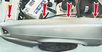 Переднее крыло - снятие и установкаСнятие 1. Подготавливаем автомобиль к выполнению работы (см. "Подготовка автомобиля к техническому обслуживанию и ремонту"). 2. Снимаем подкрылок левого переднего крыла (см. "Подкрылок переднего крыла - снятие и установка"). 3. Отворачиваем две гайки левого крепления бампера к кузову и опускаем край бампера вниз (см. "Передний бампер - снятие и установка"). 4. Снимаем переднюю часть декоративной накладки порога (см. выше, "Накладка порога - снятие и установка"). 5. Снимаем облицовку фары (см. "Блок-фара - снятие и установка"). 6. Снимаем указатель поворота левой фары (см. "Передний указатель поворота - снятие и установка"). 7. Снимаем боковой указатель поворота (см. "Боковой указатель поворота - снятие, замена лампы и установка"). 8. Ключом на 10 мм отворачиваем саморез крепления крыла к кронштейну кузова.
