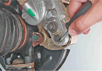 8. Удерживая от вращения направляющий палец рожковым ключом на 17 мм, ключом на 13 мм выворачиваем его болт.