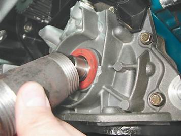 5. Наносим чистое моторное масло на рабочую кромку нового сальника и запрессовываем его через оправку или отрезок трубы подходящего диаметра так, чтобы наружная кромка сальника была заподлицо с кромкой его посадочного отверстия.