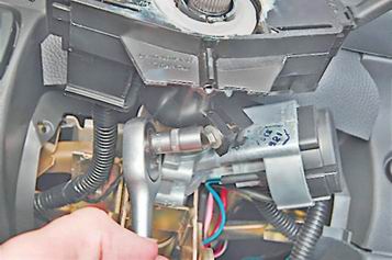 * Обозначения выводов нанесены на корпус переключателя. Установка переключателей Устанавливаем переключатели в последовательности обратной снятию. Снятие переключателей в сборе с соединителем 1. Снимаем рулевое колесо (см. "Рулевое колесо - снятие и установка"). 2. Снимаем декоративные накладки рулевой колонки (см. "Декоративные накладки рулевой колонки - снятие и установка"). 3. Торцовым ключом на 8 мм отворачиваем на несколько оборотов стяжной болт крепления соединителя подрулевых переключателей. 4. Снимаем соединитель с рулевой колонки.