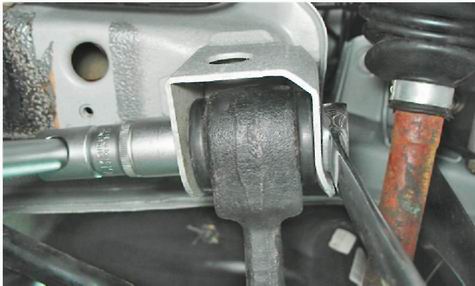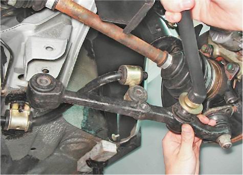 Поперечный рычаг подвески - снятие и установкаДля выполнения работы потребуется: - смотровая яма или эстакада; - бородок. Снятие 1. Подготавливаем автомобиль к выполнению работы (см. "Подготовка автомобиля к техническому обслуживанию и ремонту"). 2. Снимаем переднее колесо (см. "Колесо - замена"). 3. Снимаем брызговик двигателя (см. "Брызговик двигателя - снятие и установка"). 4. Отворачиваем два болта крепления шаровой опоры к поворотному кулаку (см. "Шаровая опора стойки - снятие и установка"). Внимание! Выполняя следующую операцию, соблюдайте осторожность, так как стабилизатор находится в напряженном состоянии. 5. Вынимаем болт крепления стойки стабилизатора к рычагу (см. "Стабилизатор поперечной устойчивости - замена стоек"). 6. Двумя ключами на 19 мм отворачиваем гайку болта крепления поперечного рычага к кронштейну кузова и вынимаем болт.